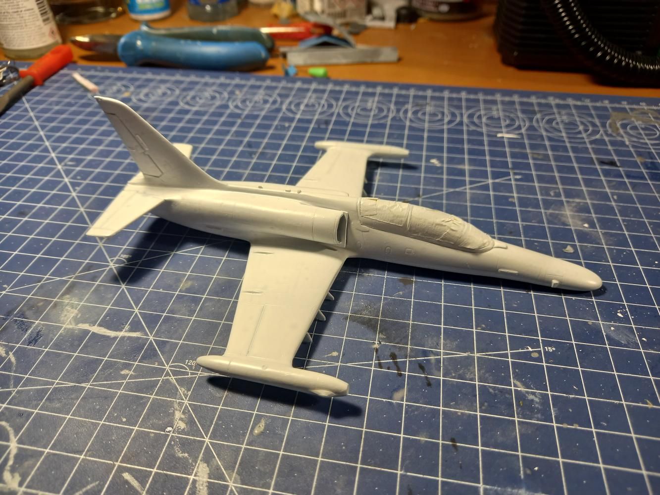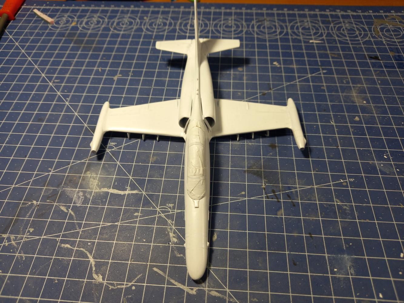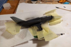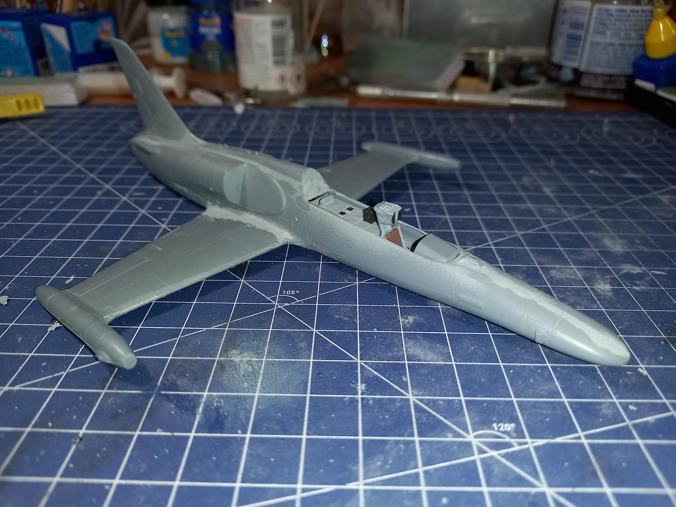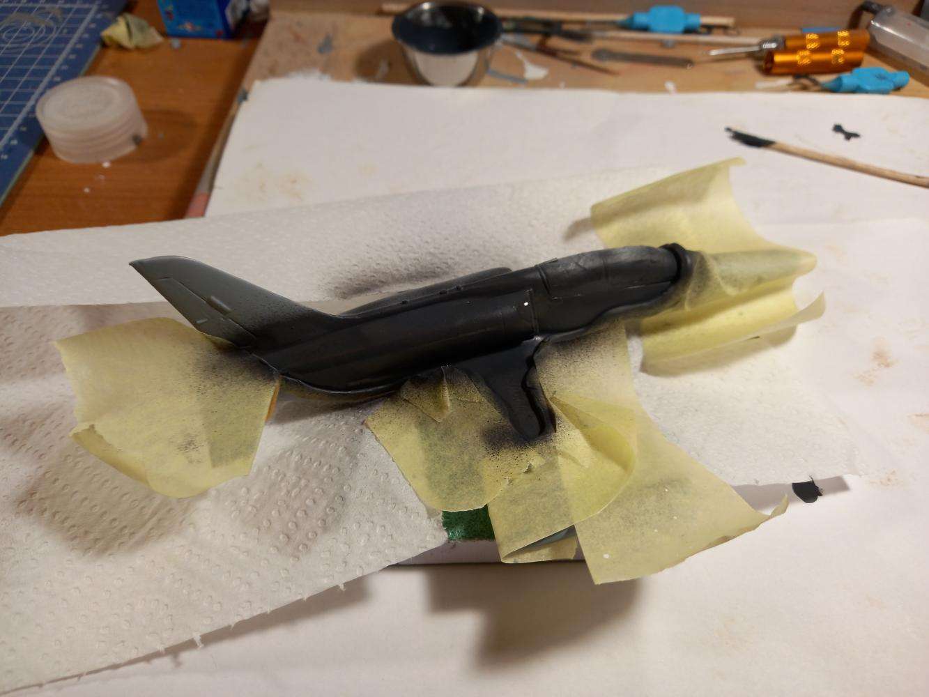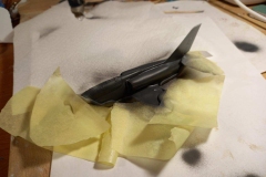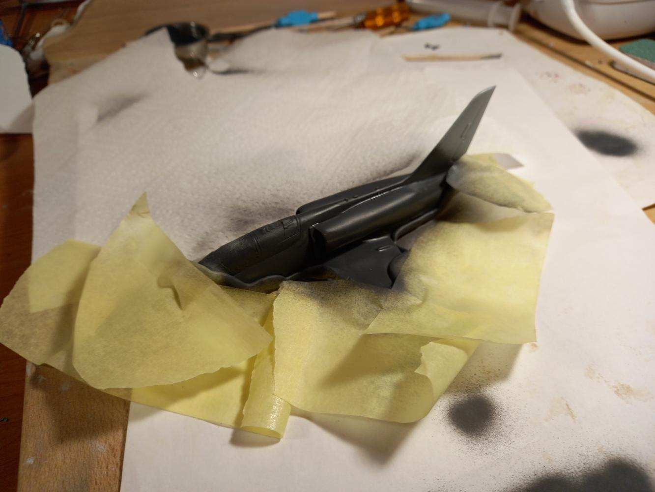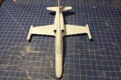 Model, jak sem již psal, je v měřítku 1:72. Stavba není pro úplné začátečníky. I Já se za něj sice považuji, ale touha tento model postavit, byla silnější než já. Chce to malinko zručnosti a zkušenosti se tmelením. Kdo je zvyklý na Revell, Academy, Eduarda, tak bude určitě zklamán, neboť výlisky nejsou tak přesné a nesedí na sebe tak jak u jmenovaných značek. Trup seděl celkem dobře, když nepočítám dotmelení spojů. První problém nastal se spojením křídel a trupu. Na spodní straně vznikaly velké "schodky" které bylo nutno dotmelit. Další problém, který zabral spousty tmelení a broušení byla horní část trupu a dopasování "sacáků". Mezi trupem a sacáky byly velké mezery a nerovnosti. Dotmelit je zabralo více času, než jsem doufal. Po všech problémech se tmelením a dopasováním přišel na řadu základní nástřik. Ten se povedl na první dobrou až na nějaké drobnosti. Po základním nástřiku přišel na řadu vrchní.